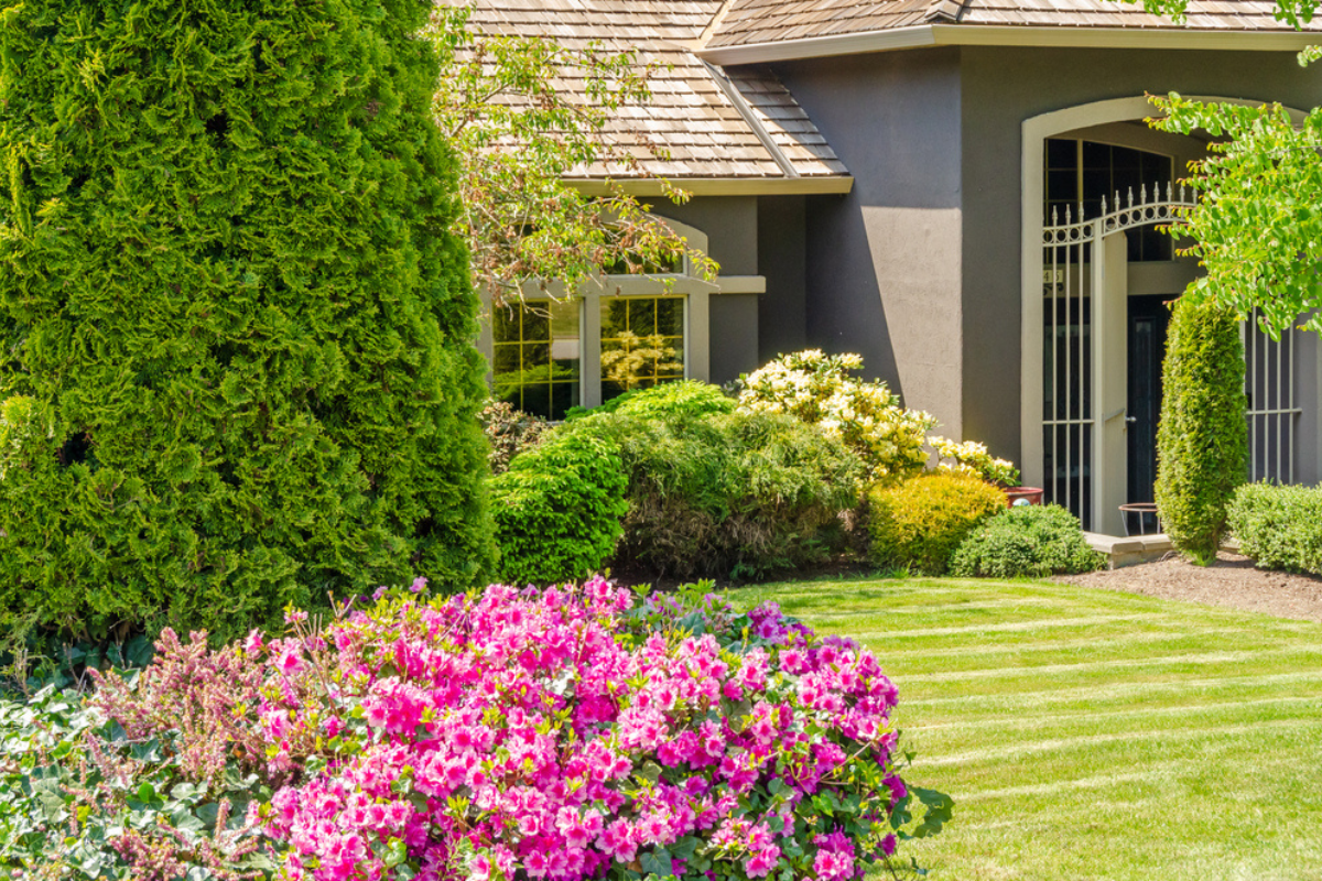 - terenul din fața casei este potrivit pentru a amenaja o zonă cu gazon, diverse specii de flori, plante și arbuști (aceștia din urmă ar trebui plantați în special în proximitatea gardului, pentru ca, în timp, să formeze o barieră fonică și vizuală menită să-ți asigure intimitatea mult dorită);